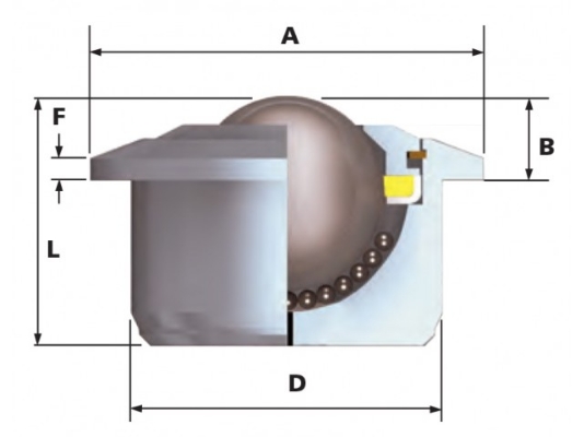 Esfera transferidora de construção robusta, com esfera de carga Ø22,2 mm, possui alta capacidade de carga e um perfil baixo. Disponível em diferentes materiais. Possui orifício de saída de sujeira.